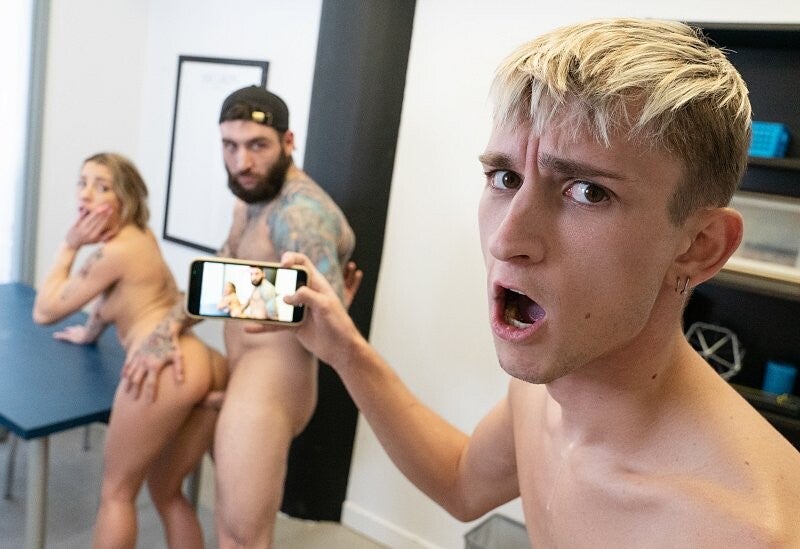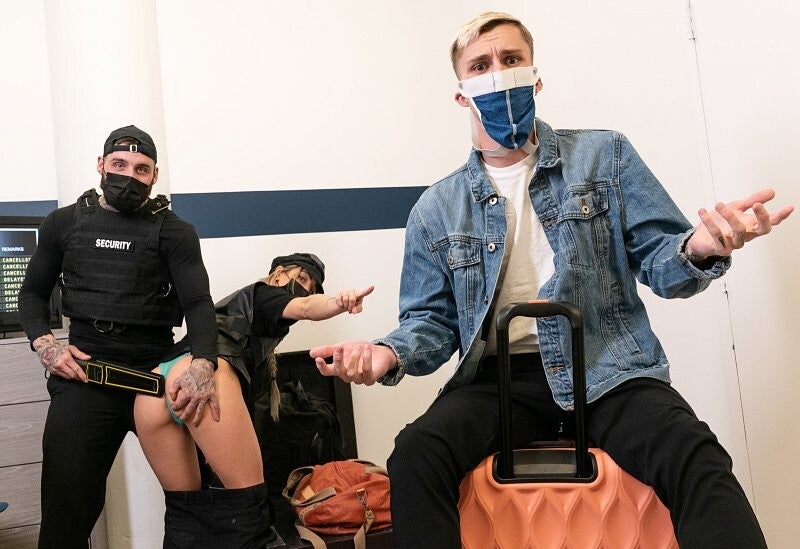 After all the flights are cancelled, customs agents Shana Lane and Tony D'Angelo have to find another way to entertain themselves in the empty airport. Shana pulls down her uniform trousers to show her coworker her tight booty, and Tony spanks her with the wand metal detector. They're so distracted, they almost don't notice solo traveler Theo Brady sneaking past them through security! When they catch him, Tony pushes him up against the wall, and Theo sucks the tattooed hunk's cock, but Shana wants her fun too. She pulls Theo into the security office and rips open his pants, finding the butt plug he's smuggling in his hole. Shana plays with it as she rubs her pussy, until Tony busts in, rimming Theo, then fucking him doggystyle as Theo licks Shana's pussy. The guys take turns fucking Shana's pussy and her mouth, then Tony licks her as the passenger cums on her tits. Shana and Theo share Tony's load, but Theo is about to break one last rule...