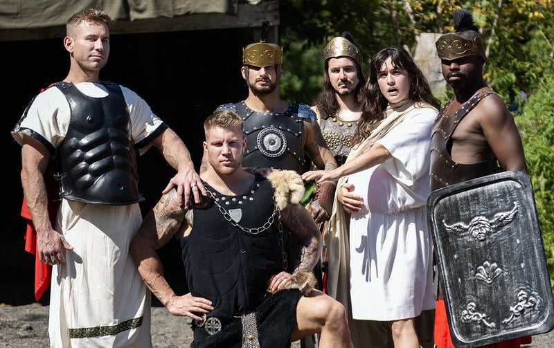 Senators Cassius and Brutus (Sumner Blayne) have chosen Spartacus as their champion, but they learn Caesar intends to poison him! The emperor's rivals hatch a plan to find a secret champion, the great Gallic warrior (Filou Fitt) who terrorized Caesar's army and slew a hundred legionaries single-handed. Brutus travels to the wilds of Gaul to take him back to Rome, but the muscular warrior isn't pleased at being taken captive... at least until Brutus explains this is a chance to help bring down Caesar. Brutus seduces the fighter with his body as well as his rhetoric, sucking the great Gallic lance. The massive top licks Brutus's culus and penetrates him, pounding the senator on his side and on his back till they both cum.