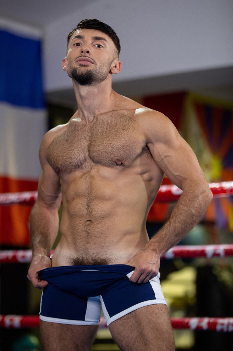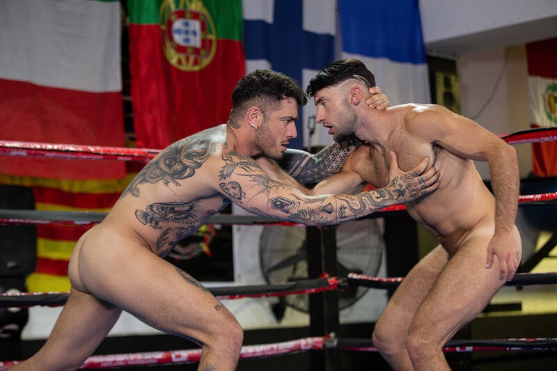 Wrestlers Alex Ink and Jolian are ready for their match, and when the referee blows his whistle, it's on to see who will be first to pin the other! After some jockeying for position, it's Alex who gets Jolian face-down on the mat, but his finger against the opponent's hole is against the rules. Alex grinds against Jolian's ass, and the guys are so into it, they don't even stop when the ref calls the match! Jolian sucks the top, and Alex teases his hole with his fingers and tongue before sliding his cock inside. Jolian gets on top as he rides Alex, who puts him in a headlock while the bottom sucks him, then pins Jolian again for a 69. Jolian rides him till he cums, then takes a facial from the champ!