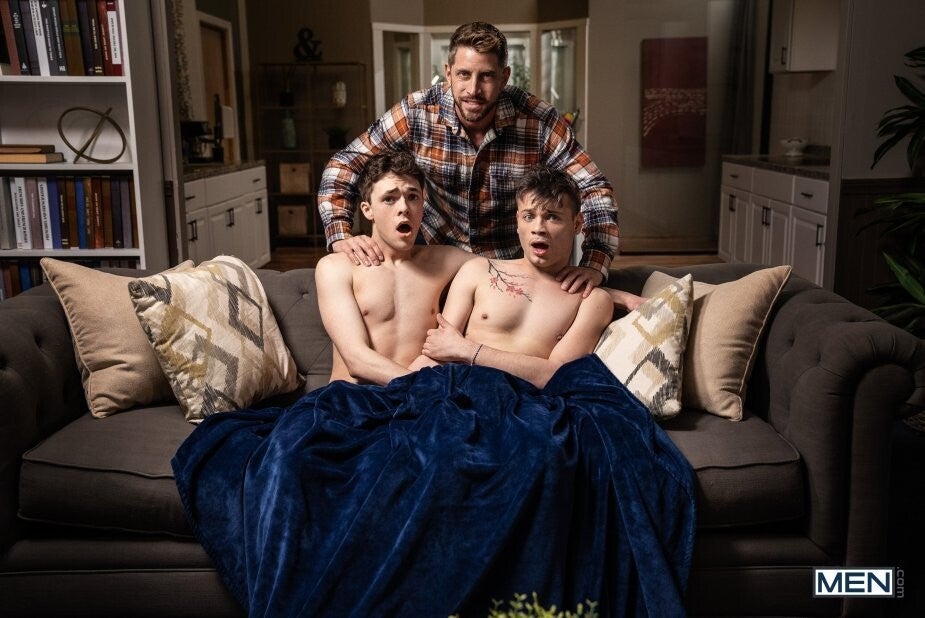 Troye Dean knows the best way to make his new stepbrother, Ryan Bailey, feel welcome... making out with him! The twinks leap apart when Ryan's new stepdad, Johnny Ford, enters, but he just wants to be sure that Troye is showing Ryan around... and when he leaves to make them a snack, Troye shows Ryan's lips the way to his cock. Troye gets inside a chair slipcover and pokes his dick through a hole so that Ryan can ride him as they watch a movie under Johnny's nose. When Johnny conks out, the twinks are free to fuck right out in the open, and they do, first doggystyle before Ryan climbs into Troye's lap and sits on his dick. After pounding his stepbro in missionary, Troye pulls out to cum and licks Ryan's balls as the bottom jacks off... and shoots a load that hits his new stepdad in the head!