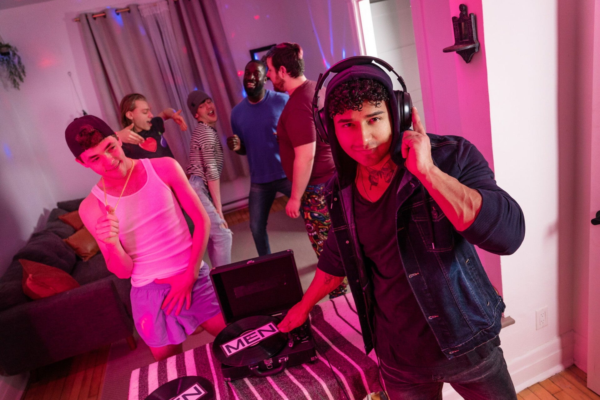 When hot DJ Kenzo Alvarez shows up to play his party, Troye Dean can't take his eyes off him. Kenzo shows him a few things at the decks and the guys start kissing, until Troye has to let his friends in. The horny host crawls under the table to suck the DJ, and Kenzo sneakily fucks Troye doggystyle... until they get caught! Everyone storms out, and the sexy top is free to pound Troye missionary on the table. The bottom rides the DJ's big dick, and cums on Kenzo's vinyl before taking a facial.