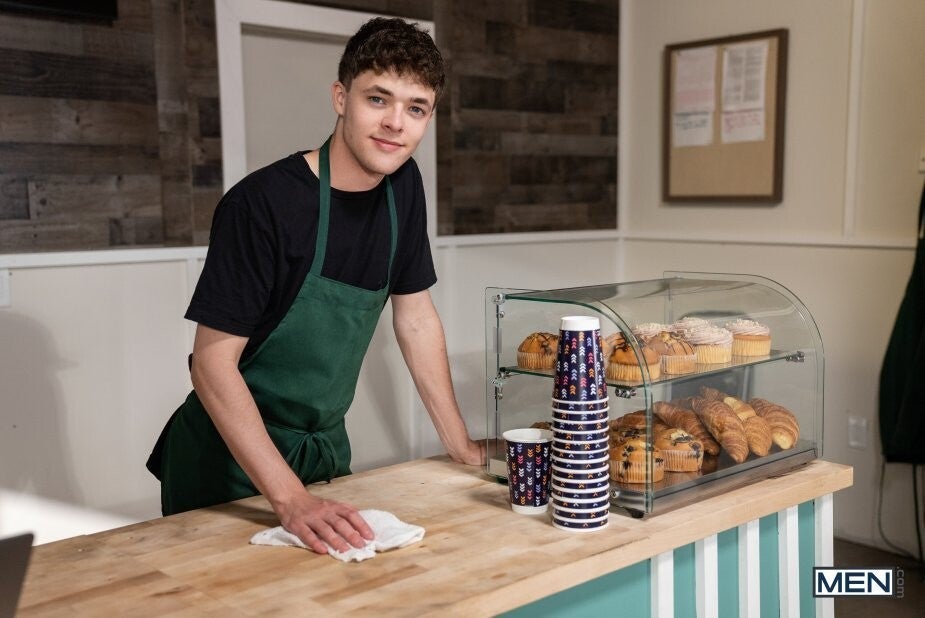 New barista Troye Dean is trying to figure out how the POS works when he spots hottie Angel Rivera sitting in the drive through with his dick in his hand. Angel just wants a large black coffee, but Troye tells him with a wink to cum inside, because it might take a while! The cafe employee is thirsty for Angel's cock, and the top bends Troye over the counter to tongue his hole, then pound him doggystyle. Troye rides Angel until a honk summons him to the drive-through window, and he spills a coffee on a customer as Angel fucks him from behind! Troye shoots his load as he rides Angel on the counter, then takes the top's cream on his face.
