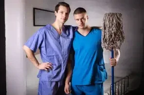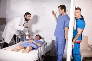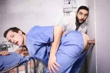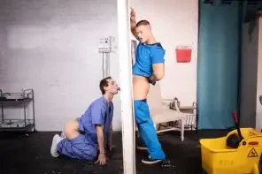Hospital nurse Clark Delgaty finds a surprise while mopping the floor: a hidden glory hole! He peeks through and sees sexy nurse Benjamin Blue changing into scrubs. Benjamin gets a surprise of his own when he sees Clark's cock coming through the hole and eagerly sucks it, then tries to hide it from a doctor and patient as he backs his ass onto it! Clark fucks Benjamin doggystyle on the hospital bed, and the horny bottom rides him reverse, as the doctor sneaks back to peek through the hole. Benjamin cums as the top pounds him in missionary, then Clark fills the bottom's mouth with jizz!