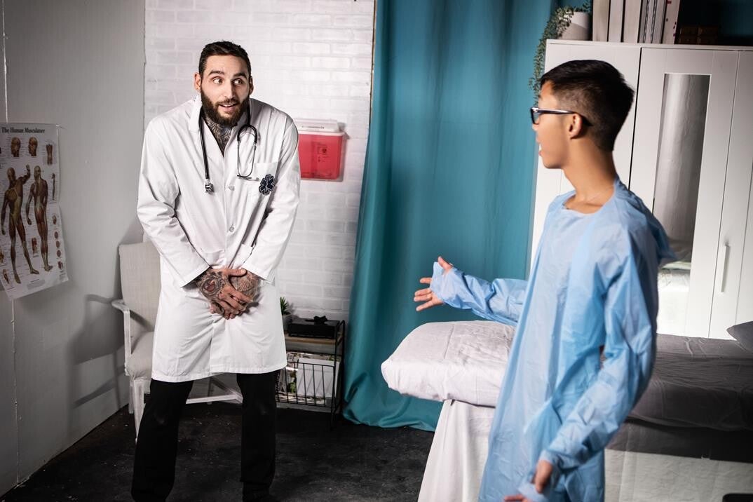 Dr. Tony D'Angelo is peeking through the gloryhole he found, watching the nurses fucking in the next room, when his next patient, Dane Jaxson, comes in and catches him with a stiffy! Tony decides to skip straight to the prostate exam, and Dane moans as the sexy doctor fingers his hole, telling him to go even deeper. Tony is happy to oblige, fucking Dane in missionary and even using the ultrasound so he can see his cock moving in and out of him! Tony does an oral exam, penetrating Dane's mouth, then fucks him doggystyle. The bottom rides the doc, stroking himself till he cums, then takes an injection of jizz in his hole!