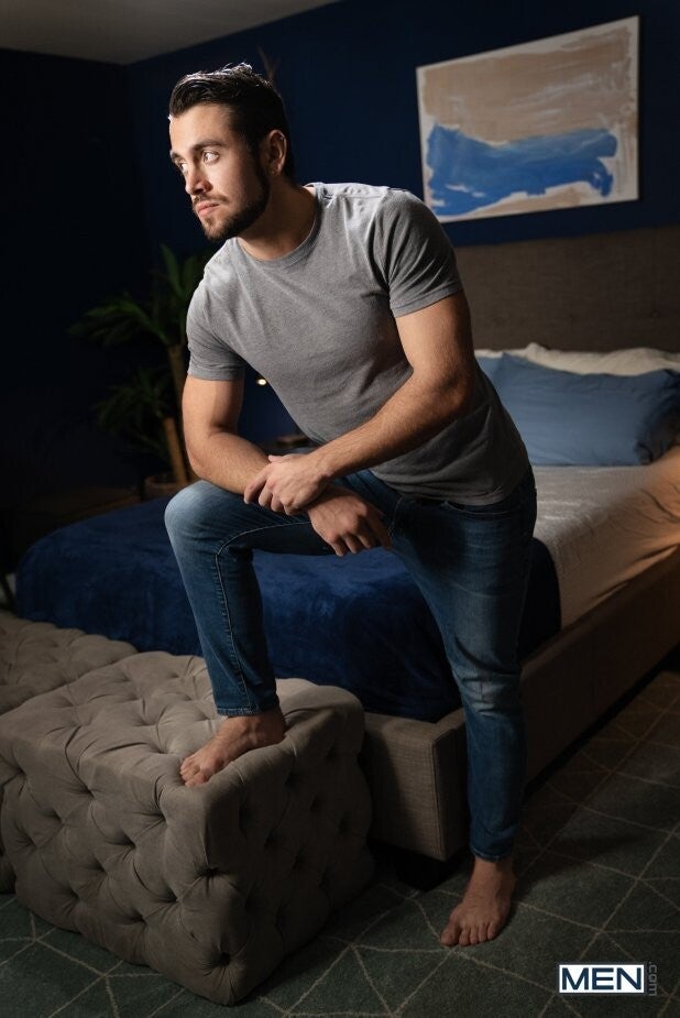 Dante Colle is thinking about his cute crush Caden as soon as he wakes up, so he texts him to see what he's up to. Caden eagerly heads to the bearded top's after his workout, and the guys start kissing almost before he's through the door! They collapse to the bed, undressing each other and sucking each other's cocks before they 69. Dante feeds Caden his balls, then fucks the bottom in spoon position. Dante penetrates Caden in doggystyle, then pounds the bottom on his back till Caden cums before filling him with a creampie.