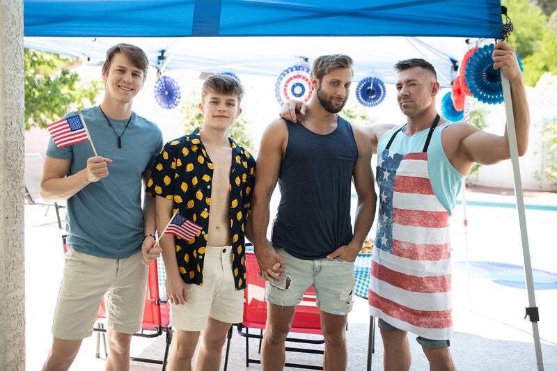 Bruce Beckham mans the grill at his Fourth of July cookout, ready to get the party started when his guests arrive, but Dom King's boyfriend Jake Preston wants a taste of the host's sausage! Jake flashes Bruce his ass, then crawls under the table to suck the muscular hunk's dick. When Dom catches them, he blows his top, but after he follows Bruce inside, Bruce calms him down by blowing him. Dom licks Bruce's hole, then gives him his huge bratwurst! Bruce can't believe how big that dick is, but he takes it like a pro as he rides the top, then gets pounded bent over the table. Bruce cums as Dom hits his spot fucking him in missionary, and Dom shoots on his face.