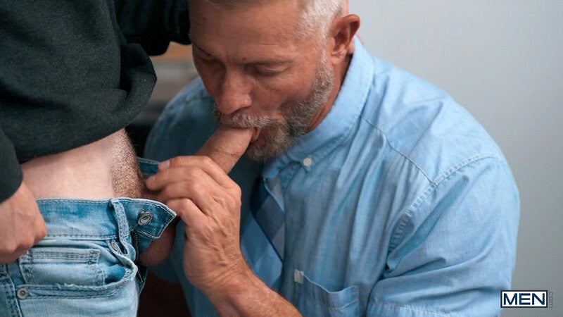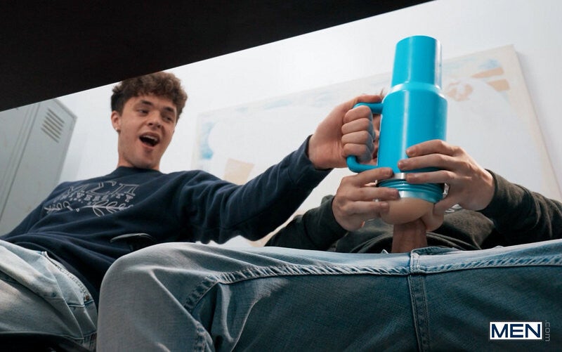 Frat bro Jake Preston isn't ready to concentrate on learning first thing Monday morning, so while Professor Greg Dixxon lectures at the board, he takes the top off his coffee mug-shaped stroker and starts fucking it! His seatmate Troye Dean reaches over to help him out, but when Greg sees Jake's hands in the air, he thinks the twink is volunteering. He calls Jake up to the board and catches him with the stroker on his dick, ending up with a face full of Jake's cum. It tastes so good, he orders the other students out and sucks Jake's cock, then tells him to use his hole. Jake bends the prof over his desk, then Greg rides his cock. The professor cums as Jake drills him on his back on a table, then gets down to take more of the student's jizz on his face!