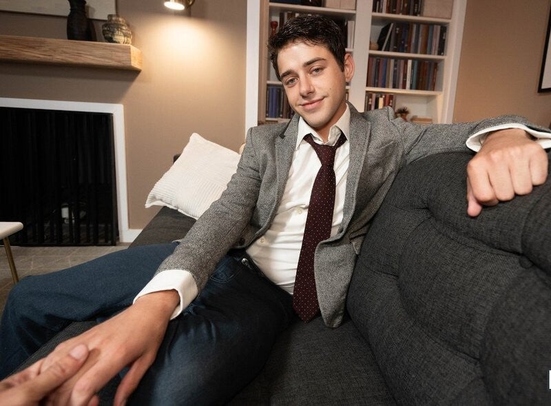 Ever wanted to follow twink Joey Mills for a day? His morning starts with a rude awakening from Hayden Harding who gets him out of bed with a water gun! The guys playfully roughhouse in the locker room and take a break from studying in the library for a game. Outside on the bleachers, Joey reclines in the sun with a book. And of course, any day with a pornstar wouldn't be complete without sex! Hayden takes his boner out as the guys chill on the couch, and Joey sucks him, getting naked for Hayden to play with his hole, then fuck him doggystyle. Joey lies back to get fucked in missionary, and cums as he rides the hairy top, then hurries into position to take a facial, sucking out every last drop.