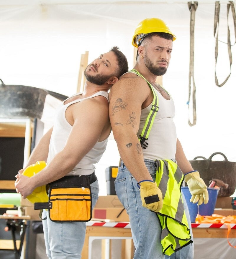 Muscular construction worker Nik Fros is taking his lunch break and decides to satisfy another kind of hunger, pulling out his cock and stroking it. When his bearded coworker Alex Palmieri sees him, Nik motions him to join him! Nik is surprised when Alex goes for his dick, but someone else's fingers feel better, so soon the guys are giving each other a hand. Alex sucks Nik, and the top bends Alex over the workbench, fingering and then fucking his hole! The guys frot before Nik drills Alex on his back, then the bottom sits on his cock, and they jack themselves off till they cum. Best lunch break ever!