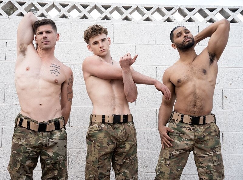 Recruits Jack Waters and Derek Spears do their calisthenics until Jack tries to crawl through a tire and gets stuck! Derek loves the sight of the private bent over and grinds against his ass, and Jack sucks him before Derek gets him free. Derek rims the bottom and penetrates him, then Jack gets some more exercise as he rides that dick. The top pounds Jack against the wall, then fucks him on a tire till the bottom cums, and Derek gives him a facial.