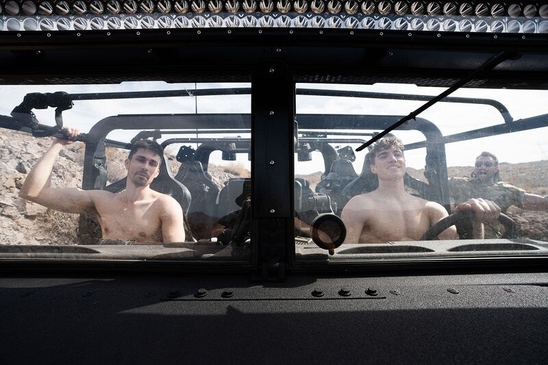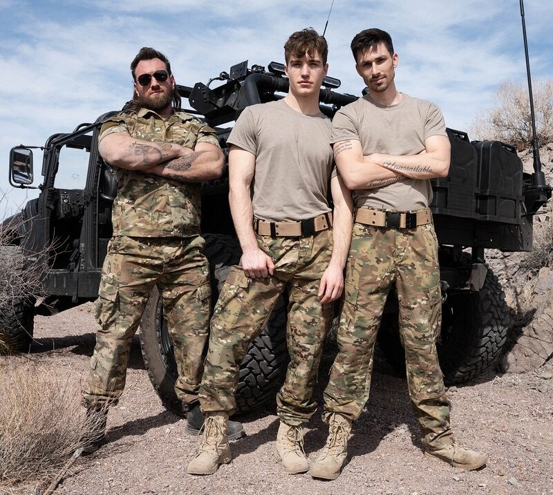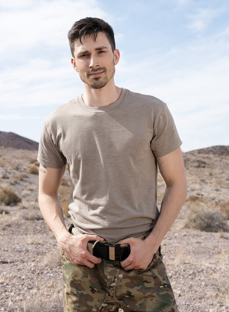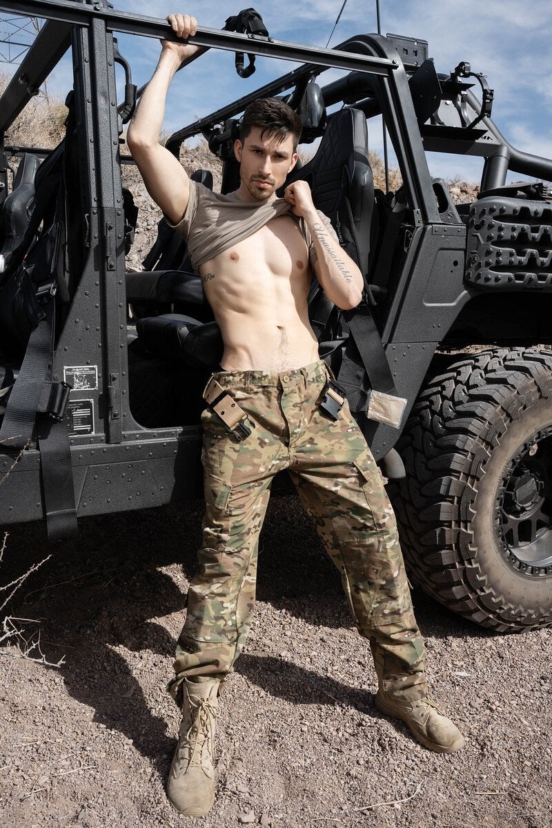 Hazel Hoffman comes to relieve his officer, Kane Fox, at his post, but Kane tells the recruit his belt isn't regulation and has to fix it, getting his hands all over the army twink. The guys kiss, and Kane pulls Hazel into the tent, where the private sucks the officer's privates, then bends over as Kane devours his hole. The officer pounds the bottom in doggystyle and spoon positions, then Hazel bounces on the top's dick. Kane fucks a load out of him on his back before cumming in Hazel's mouth.