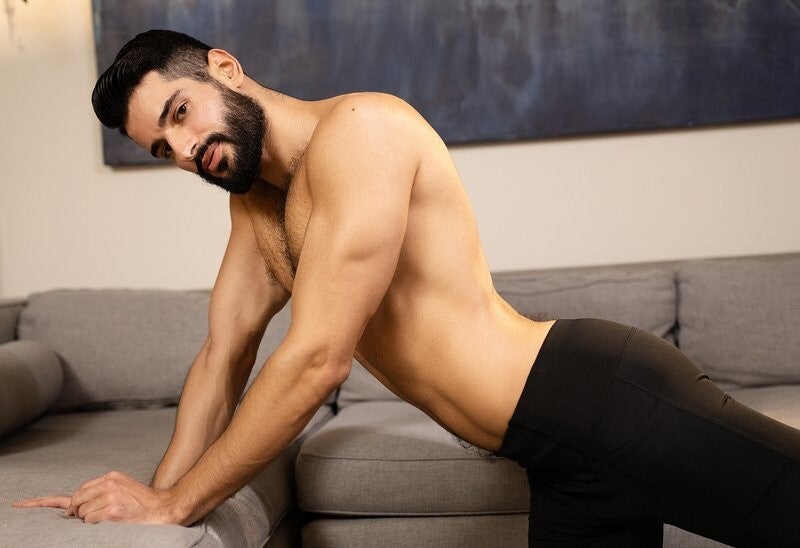 Ashton Summers and Samm Fitness set up their yoga mats in the living room and start their meditation routine, but horny roommate Nikolai Lazaro has a more embodied activity in mind. He sneaks up to Samm and licks his fingers, telling him to stay quiet as he touches his muscular chest while Samm jacks off. After Samm cums, Nikolai switches his full focus to Ashton, ripping open the bottom's shorts as Ashton goes into a deep stretch and licking his hole, then sucking him before he fucks the hottie doggystyle. Ashton concentrates on the sensations as Nikolai drills him on his back and from behind, then the guys sit side by side and stroke themselves off.