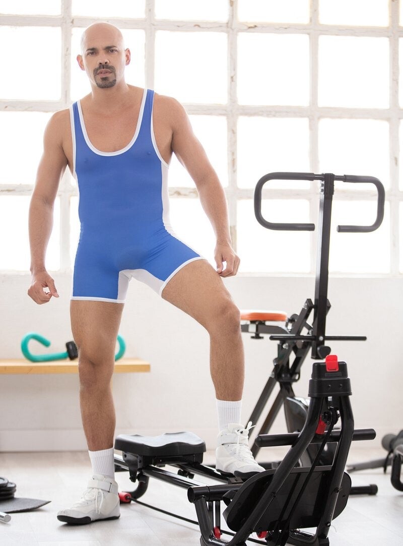 This rowing team are working out in matching singlets, but MrDeepVoice's teammate Alexandro Cabrera is fixated on his ass, snapping him with a towel yet again. MrDeepVoice decides to retaliate, suggestively sucking the rowing machine handle and giving Alexandro a boner that isn't just impossible to hide, it rips a hole in his onesie! The bottom sneakily sucks the shaven-haired hunk, then Alexandro fucks him while their teammates are none the wiser. The top sucks MrDeepVoice before the bottom sits on his dick, and Alexandro drills his teammate face down ass up and on his back till MrDeepVoice is covered in both of their cum.
