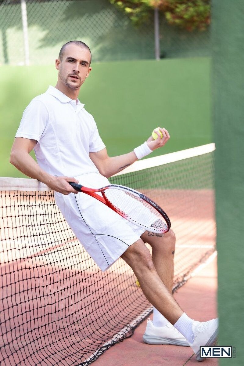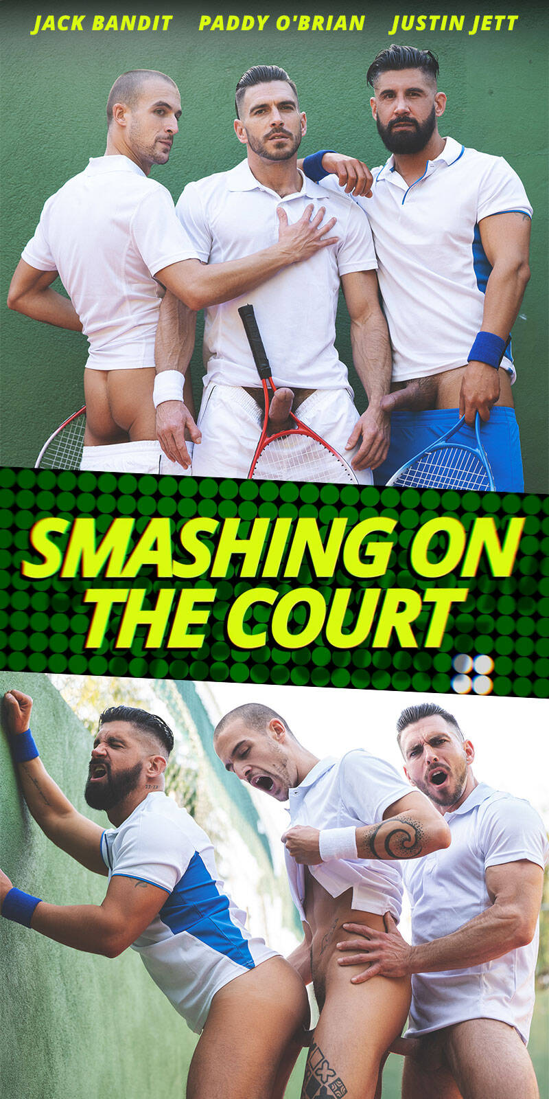 Things get tense between Justin Jett and Paddy O'Brian as they face off for a game of doubles. Paddy's husband, Jack Bandit, has his eyes on the prize, but Justin's partner is just happy to be included! Seeing Justin's frustration with his unskilled blind date, Paddy offers to partner with him, but everyone starts noticing Justin and Paddy flirting, and Justin's date storms off the court! Jack is down for a threesome, and as his husband rims their pal, he fucks Justin's throat. The husbands spit-roast Justin before forming a train. Justin cums as Paddy fucks him, then takes the husbands' loads on his beard!