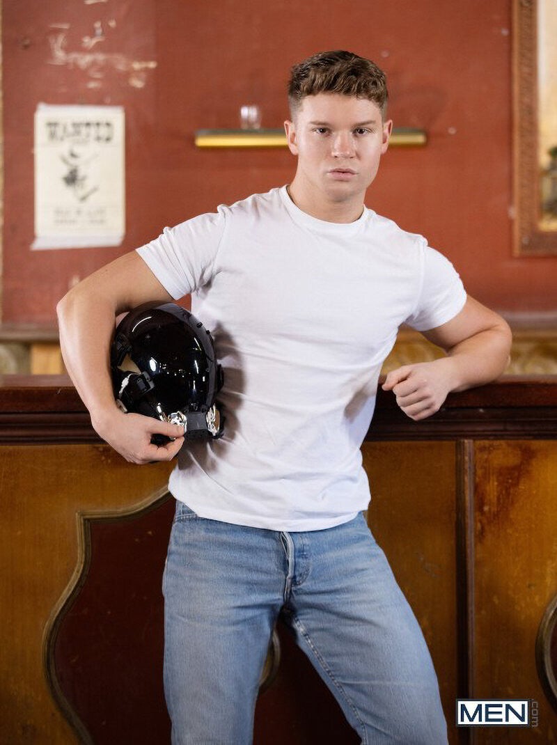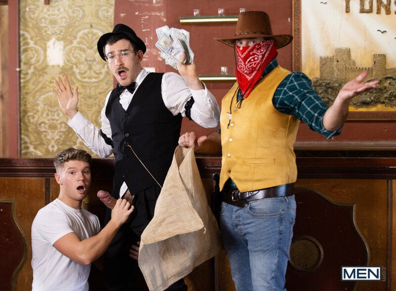Modern twink Dean Young doesn't hesitate when he finds a futuristic helmet in a package on his desk, trying it on... but he's suddenly transported to an Old West town. Bemused, the hunk strolls down the street and through the swinging doors of the saloon. Barkeep Charlie Cherry has no idea what Dean is talking about when he asks for a rideshare, but when an outlaw robs the place, he pulls Dean to safety behind the bar. Dean sees Charlie's bulge and sucks him while the barkeep loads the money in a sack, and once the robber leaves, the men 69 and fuck on the bar. Charlie leads the time traveler to the stairs, and they have a gay old time as he drills him from behind and on his back, then rides the top till he orgasms. But while Dean is cleaning Charlie's cum off his face, the barkeep finds the helmet and puts it on...