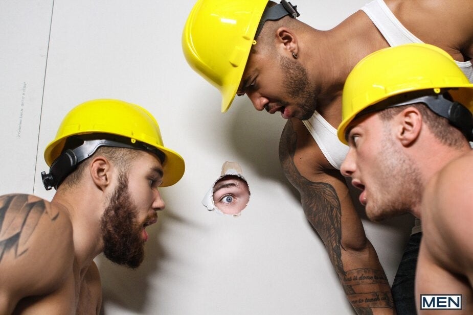 Jason, William, and Morgan are hard at work and don't notice they are being watched through a peephole on their construction site by Thyle and Joey. The two men are so turned on by their hot sweaty bodies and are more than happy to give the boys a much-needed break by offering up some ass and an eager mouth hole.