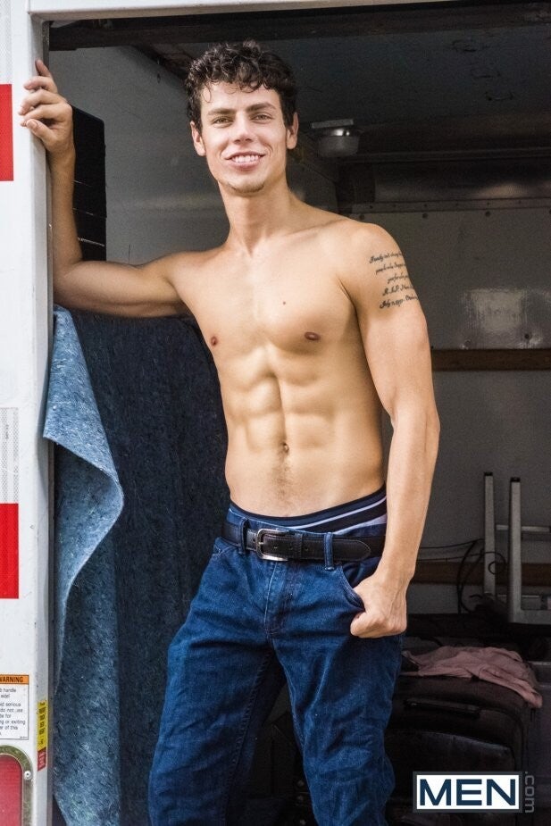 When Beaux Banks discovers that his new neighbor is the sexy Kaleb Stryker, he decides to give him a hand moving in. But when Kaleb catches Beaux sniffing his underwear in the back of his moving van, he realizes why Beaux has a reputation as the neighborhood slut. Kaleb decides the punishment should fit the crime and lets Beaux prove that he deserves his title. Beaux drops to his knees and blows Kaleb, sucking and stroking his cock right there in the back of the van. Soon Kaleb returns the favor before bending Beaux against the wall and giving his perfect bubble butt a deep and passionate rim job. Beaux can't wait any longer and takes the curly-haired hunk's cock deep in his ass, slamming his cheeks against Kaleb's thighs as he rides it all the way down to the balls. The two horned up dudes blow their loads in the back of the van, proving that there is something in nature that does want neighbors to get along.