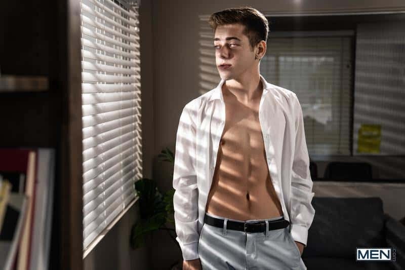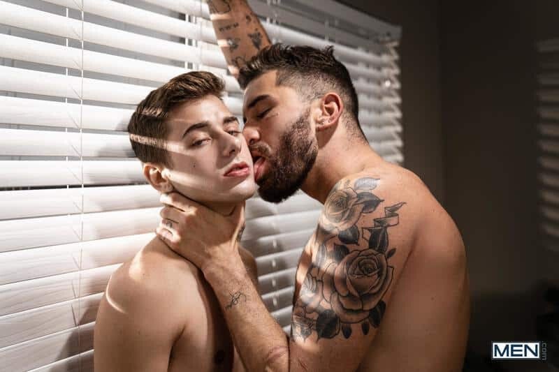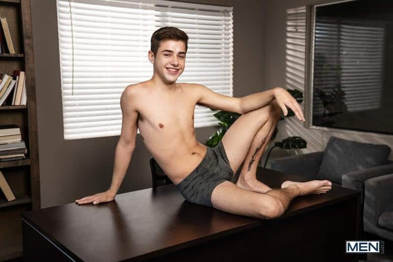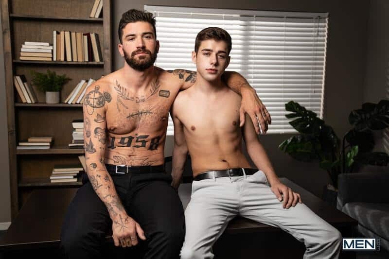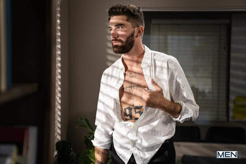 Have you always wanted to experience hooking up with your favorite Men.com stars? Try the next best thing, as bad boy hunk Chris Damned shows you just what he likes. Chris sneakily teases you in his office, rubbing the bulge in his pants as he unbuttons his white shirt to show his tattooed chest. He undresses, sniffing his shoes and socks before licking his own toes. As Chris jacks his long, thick cock, he notices twink Joey Mills watching him and wordlessly invites him to join in. The dominant top undresses Joey, kissing him and blindfolding him with his own tie before fucking his mouth. Chris rims Joey's hole, then fucks him missionary on the desk. The twink bends over the bookcase to get fucked from behind, then rides Chris in a chair. The horny top pounds Joey in piledriver, making him cum, then pulls out to shoot his own hot load in Joey's gape!