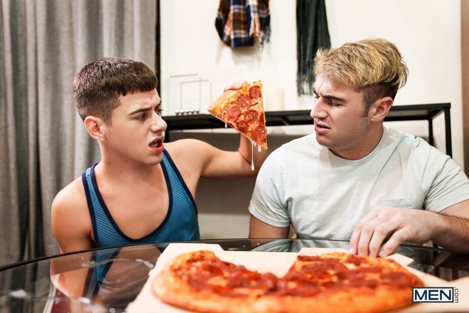 Since Archie got into the Men Pop app, he's been trying to get a rise out of his roommates with wilder and wilder hijinks. Although his "drop the towel challenge" doesn't get a big reaction from Joey Mills and Michael Boston as they play videogames, when he jizzes all over their pizza they definitely take notice. Joey checks out Archie's profile to take his revenge, then hides in his room to give him a "surprise facial" just like Archie wanted! Archie sucks out the last of Joey's cum, and then Joey deepthroats the top's cock. Archie rims Joey and then gets a close-up on his phone as he pounds his ass doggystyle. Joey climbs on top to ride Archie, then takes his dick super deep as the top penetrates him in missionary till he cums. Archie pulls out and shoots so far that he gives Joey a facial of his own!