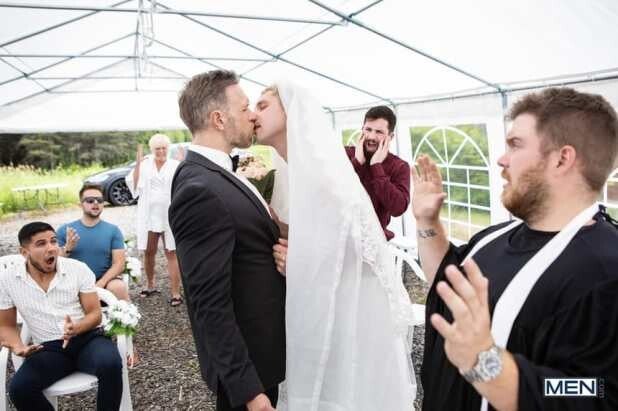 Alex Mecum is so excited to see his veiled bride walk down the aisle... until the woman he's supposed to marry runs in in her underwear, screaming to stop the wedding! Alex pulls back the veil to see his intended stepson, Benjamin Blue, who's determined to make Alex his. Benjamin kisses the groom and the guys run out to the waiting getaway car, where Benjamin sucks Alex's cock as they make their escape. Limo driver Malik Delgaty can't help getting turned on, and strokes his cock as he watches Alex rimming Benjamin in the back. The guys invite Malik to join them, taking turns sucking his huge dick before the two tops spit-roast Benjamin. Alex licks Malik's cock as the muscular driver fucks Benjamin doggystyle, and Benjamin rides Alex reverse while he sucks Malik. Then both guys lift Benjamin up as Malik fucks him stand-and-carry till the bottom cums! Alex and Malik give Benjamin a double facial, and then it's off to the airport!