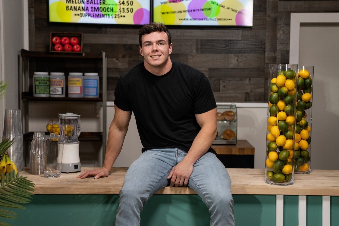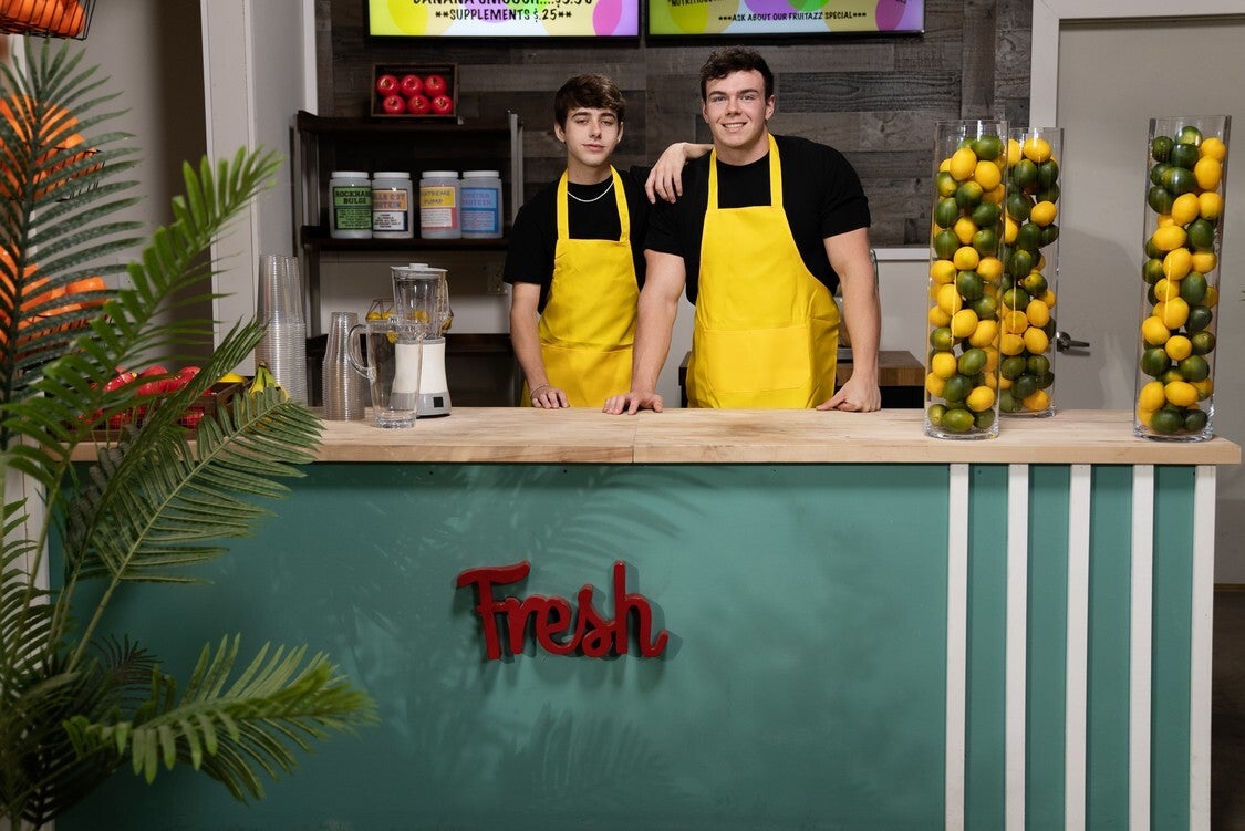This smoothie shop doesn't have any blenders, because built employee Clark Reid squeezes all the juice by hand... and by bicep... and even between his muscle ass cheeks! There's nothing like the joy in a customer's eyes as they watch their juice drip down Clark's hard body as coworker Joey Mills licks it off. These pleasure purveyors get so turned on, they spend the rest of their shift fucking on the counter before the bottom gets the employee perk of Clark's hot load on his face. Don't forget to ask Joey for his special whipped cream facial to top off your order!