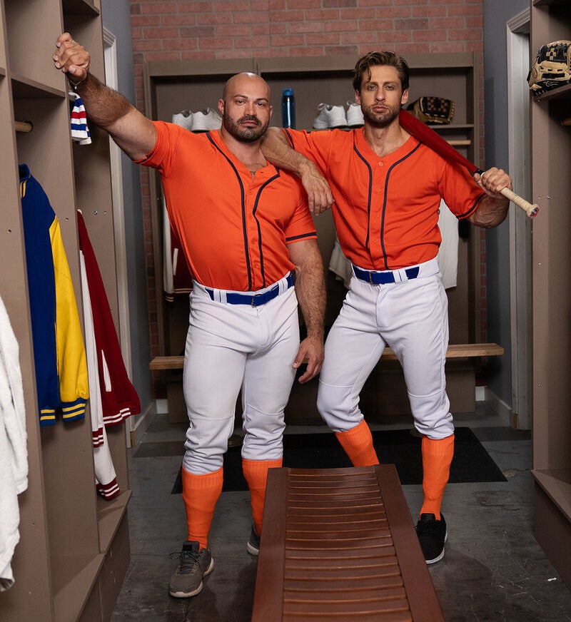 Hunk Dom King is super disappointed after losing the baseball game, but in the locker room his teammate Nick Cranston tries to cheer him up and lighten the mood with a wedgie as he gets changed. When Nick undresses, Dom can't tear his eyes away from his buddy's enormous balls! No wonder Nick's in a great mood with balls that big. Dom takes out his to compare, and fucks that big sack. The guys suck each other, then Dom bends Nick over and spreads his ass, sliding a baseball bat into his hole! Dom fucks the tattooed bottom doggystyle, and Nick rides the top. Dom holds up Nick's legs as he fucks him on the bench, and Nick drains his enormous balls before Dom pulls out and cums.