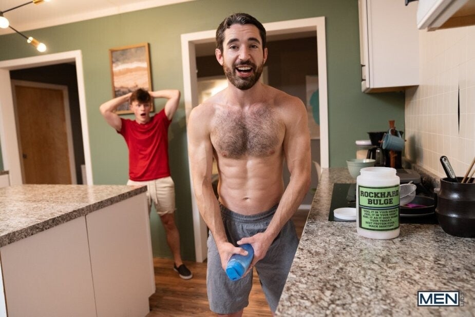 When Jake Preston walks in on houseguest Jay Stroke mixing up a protein shake in the kitchen, he thinks Jay is jacking it. He watches the muscular guy's home workout, stroking himself, then pantses Jay as he does some pullups. Jay tells Jake to get on his knees and suck him, then he blows the twink as Jake hangs off the pullup bar. The guys swap places for a real workout as Jake fucks the bearded bottom's hole, then move to the bed. Jay rides the top, and cums hard as he gets pounded in doggystyle, then Jake pulls out and shoots on Jay's ass.