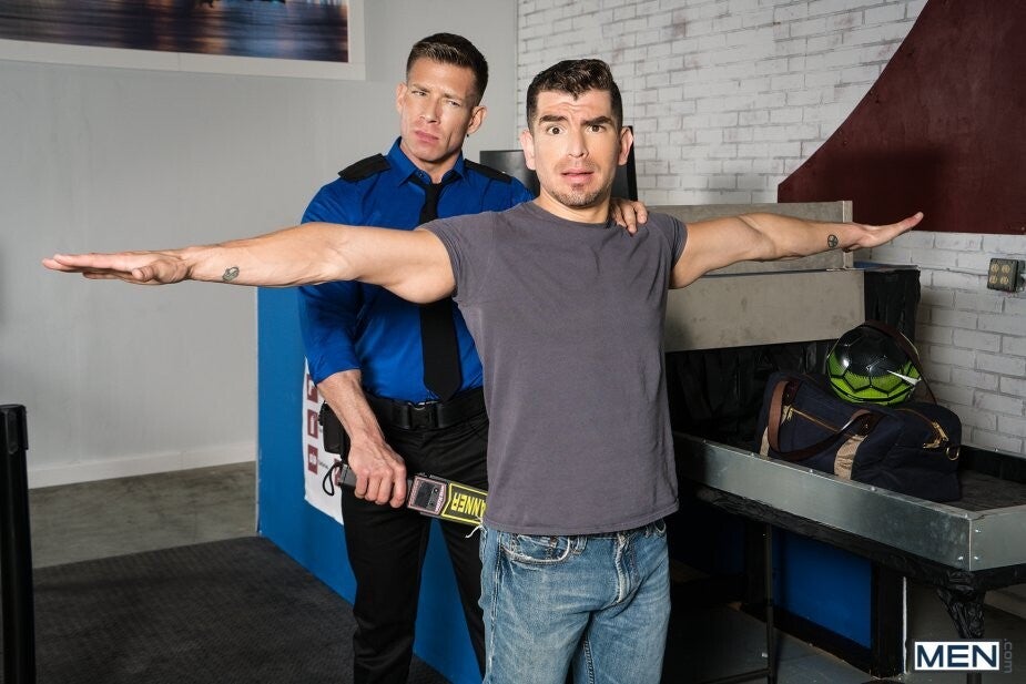 Bruce Beckham takes his job as a security agent seriously, and he isn't going to let just anyone waltz through his checkpoint. When Jeremy Spreadums comes walking through, he knows immediately that the dark-haired hottie is hiding something. As happens all too often, it turns out that Jeremy is trying to get one over on Bruce, smuggling a string of anal beads in his ass. Bruce decides that if Jeremy likes ass play so much, then he should at least have the decency to let muscle daddy Bruce try him out. Bruce bends Jeremy over and gives the hunk a long, deep rimming before he pounds his hole right there at the security counter. Jeremy can't get enough, begging for more until the muscular stud blows his load deep in Jeremy's hole.