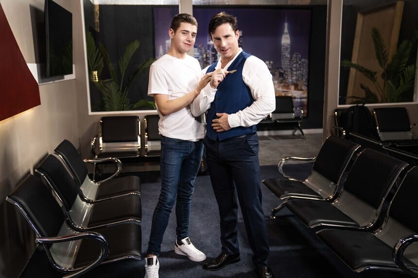 Joey Mills and his girlfriend missed their flight, but gate agent Reese Rideout is unsympathetic... until he checks out the cute twink thoroughly. He takes out his hard cock and Joey eagerly gets to his knees to suck it so well, Reese promises to upgrade him to first class. As Joey's girlfriend rests with her eye mask on, Reese crawls over to suck Joey's cock, but when she catches them and runs off, Joey decides to stick around and let Reese eat his hole. The agent fucks the twink doggystyle, then puts him on the floor for an impressive piledriver takeoff. Joey rides Reese on the seats and cums hard, making the top orgasm all over his hole.