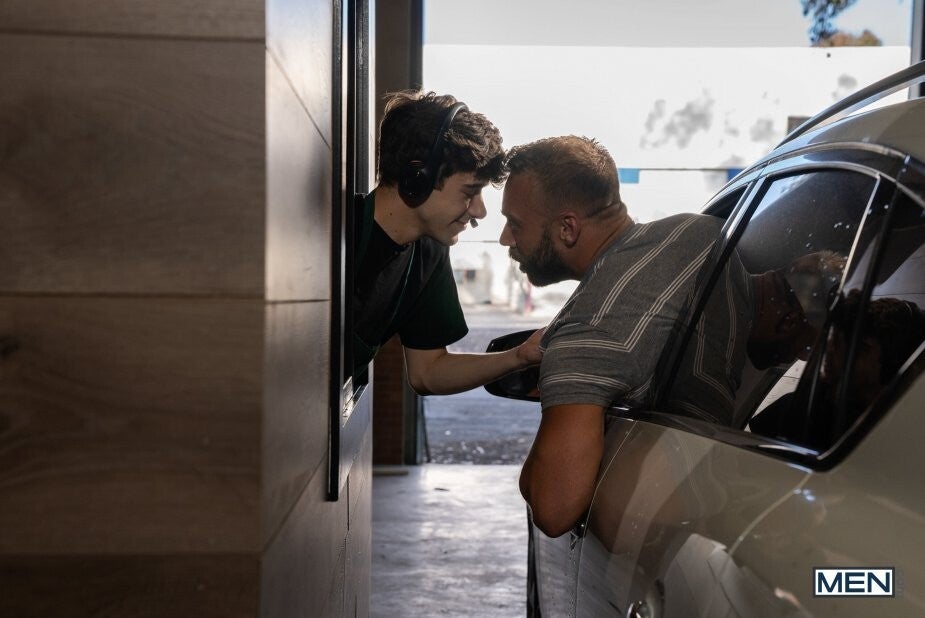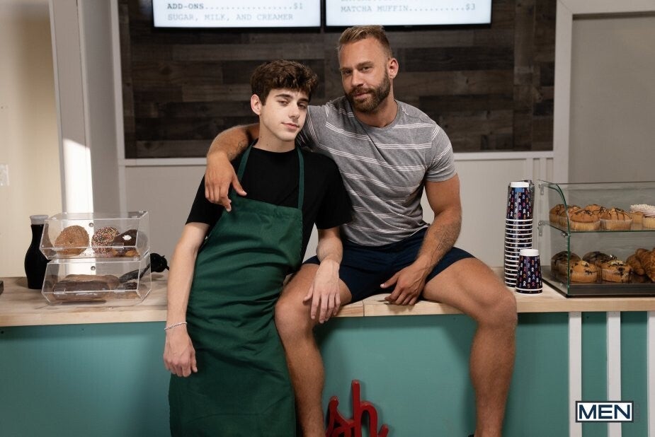 There's only one thing that will make bored barista Joey Mills do some work, and it's not training new hire Troye Dean or stocking the pastry case... When blond hunk Brogan pulls up in the drive through, Joey is ready to take care of him. He informs Brogan that they're out of cream, but he wants to taste his cream substitute, then pulling the muscular top through the window! Joey swallows Brogan's stir-stick, and the top rims his hole, then fucks him doggystyle on the counter. Joey rides the top till he cums, and takes that hot cream in his mouth just like he wanted.