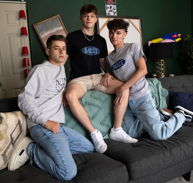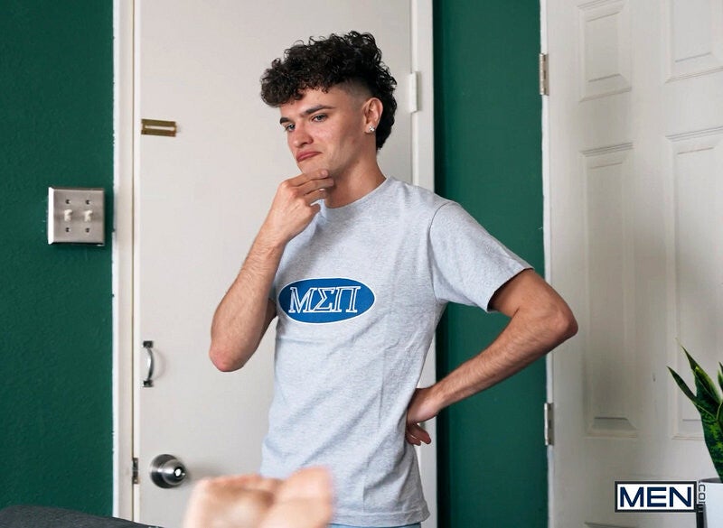 It seems like everyone in the frat house is horny today, and Joey Mills is the only one trying to study. He tells Aaron Elias he can eat his ass as long as he doesn't interrupt his reading, but once Aaron lubes up his cock and starts sliding it between his cheeks, Joey goes to the kitchen for some quiet. That doesn't last long, as Jake Preston gets hard seeing Joey with no pants, so Joey lets him fuck his armpit! Aaron comes in and fucks the other, but when the guys both jizz all over his book, it's clear no more studying is happening. Instead, Joey gets spit-roasted by the frat bros, and takes two thick loads on his face.